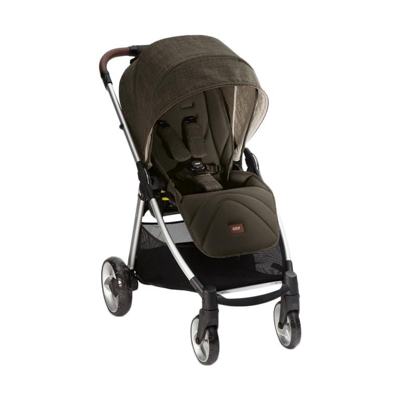 - Kanopi, seat belt, adjustable handle, 4 wheel suspensi, 5 point safety harness, roda depan dapat berputar 360 derajat, dan shopping basket